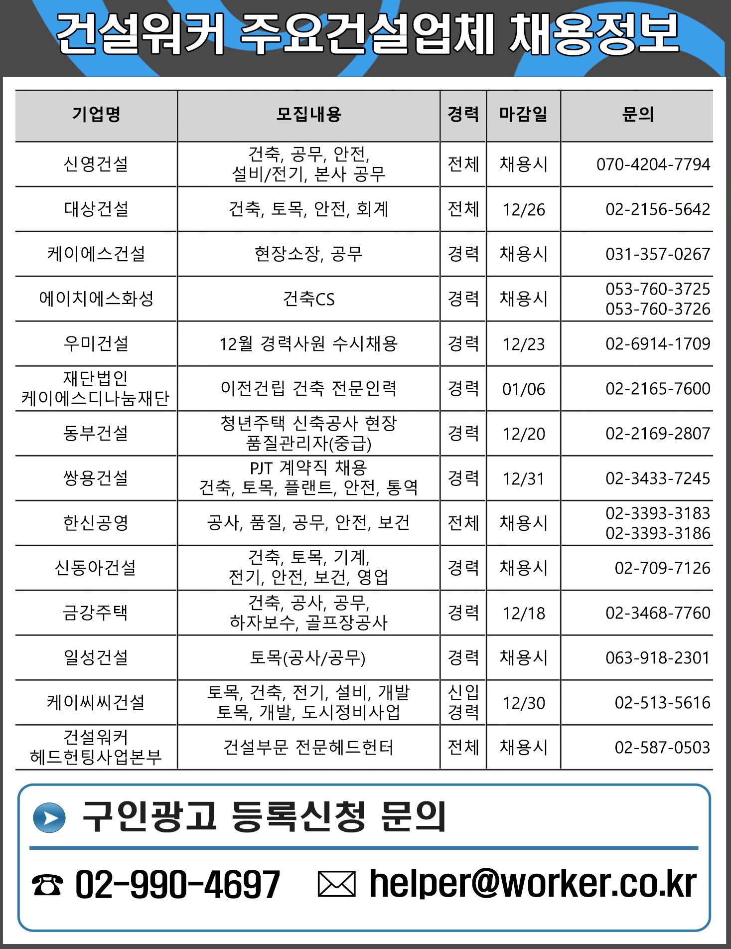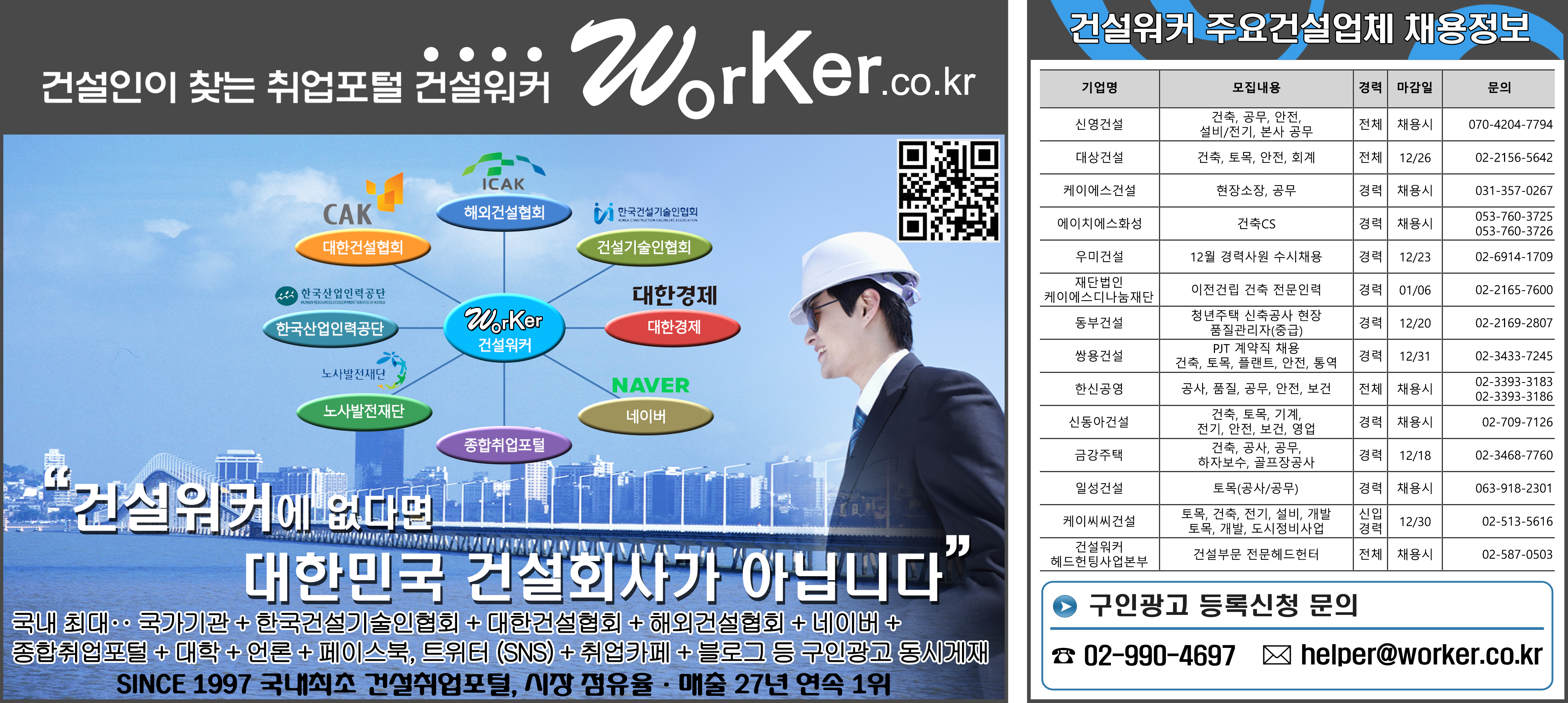 건설워커 주요건설업체 채용정보(24.12.17. 대한경제 신문 지면 게재) 건설워커 구인광고 등록신청 문의 ☎...