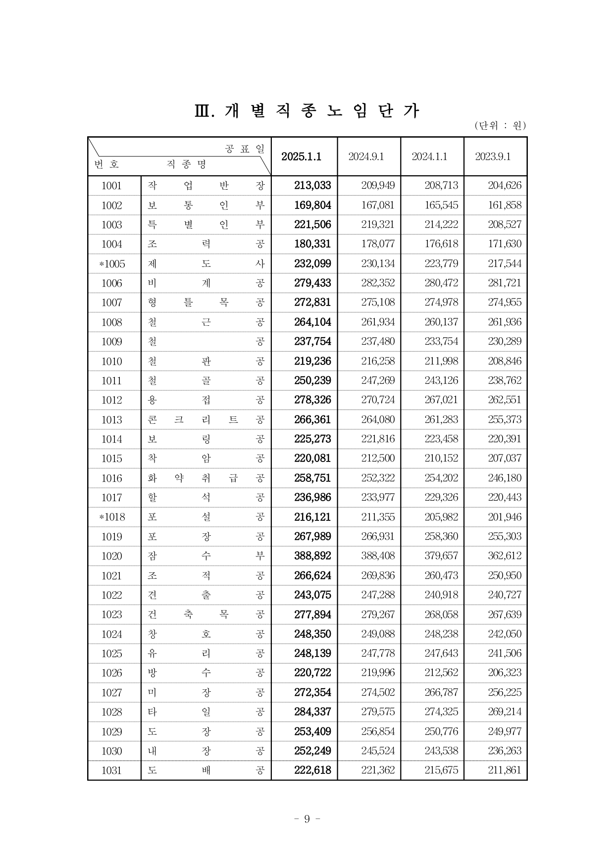건설업 개별 직종별 노임단가: 2025년 상반기 적용 일평균 임금