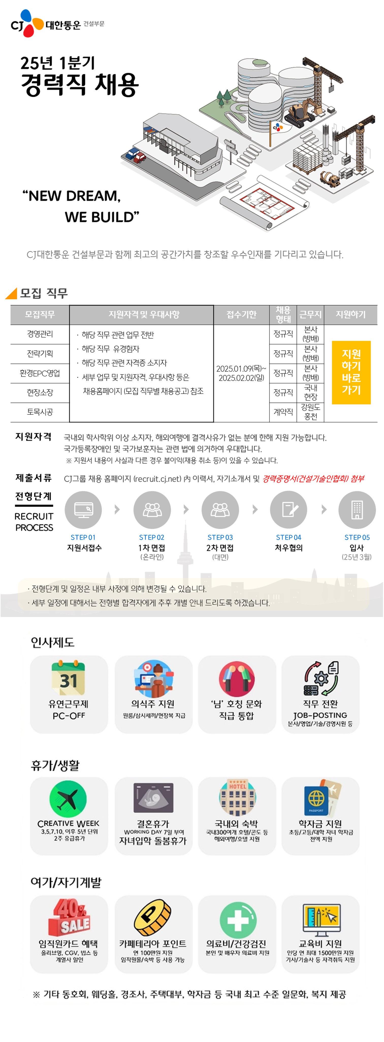[씨제이대한통운(주)] [건설부문]25년1분기 경력사원 모집(경영관리/전략기획/현장소장/환경EPC영