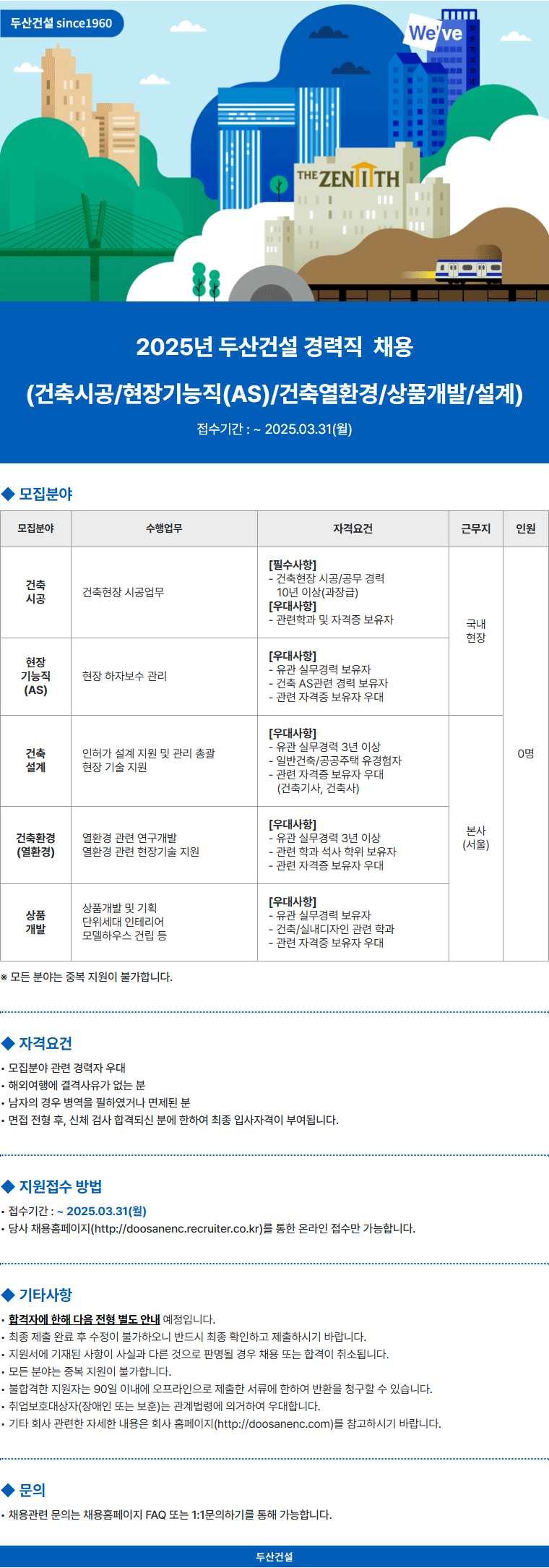 [두산건설(주)] 2025년 경력직 채용(건축시공/현장기능직(AS)/건축열환경/상품개발/설계) (마감일 :