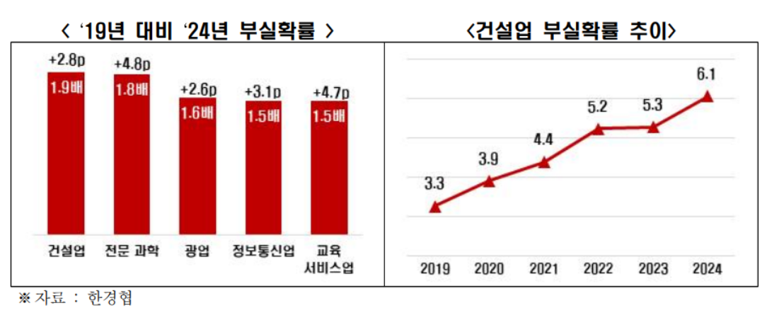 - 건설업: 2019년 3.3% → 2024년 6.1% (1.9배 상승)