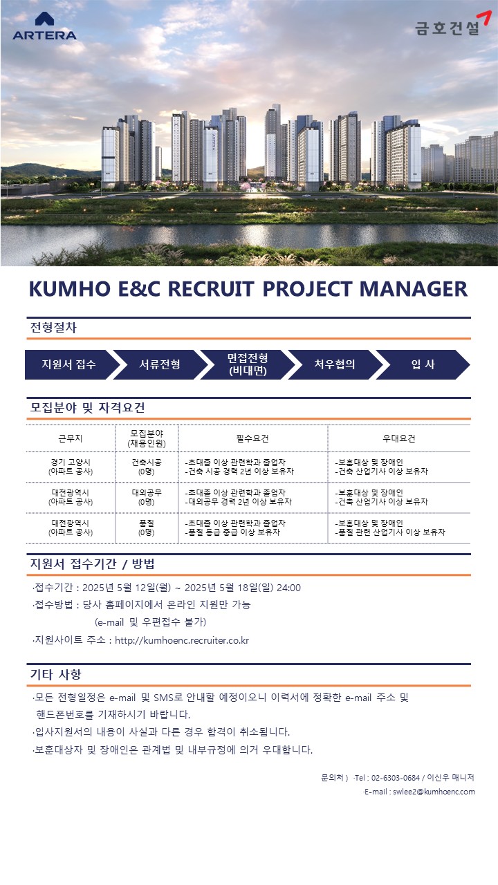이메일 및 우편 접수는 불가하며, 금호건설 채용사이트(http://kumhoenc.recruiter.co.kr)를 통해서만 지원이 가능하다.