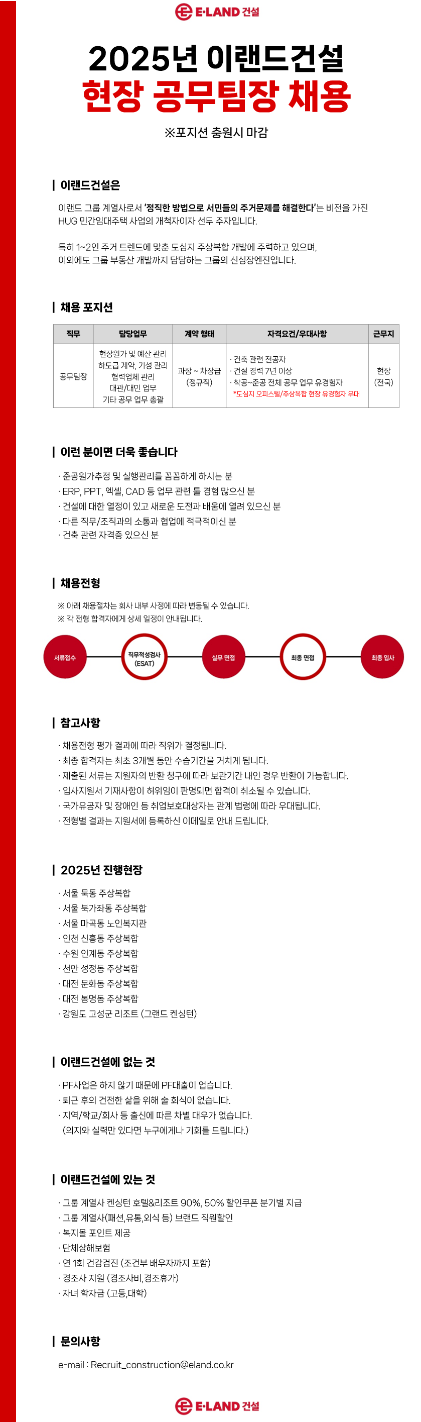 이랜드건설이 2025년을 맞아 현장 공무팀장과 안전관리직을 찾고 있습니다.