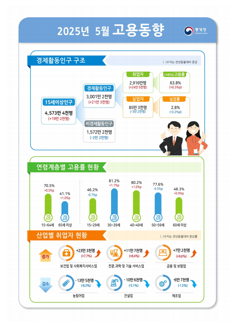 통계청이 6월 11일 발표한 ‘5월 고용동향’에 따르면, 2025년 5월 기준 15세 이상 취업자 수는 2,916만 명으로, 전년 동월 대비 24만 5,000명 증가했다. 이는 지난해 4월(26만 1,000명 증가) 이후 최대 증가 폭이다.