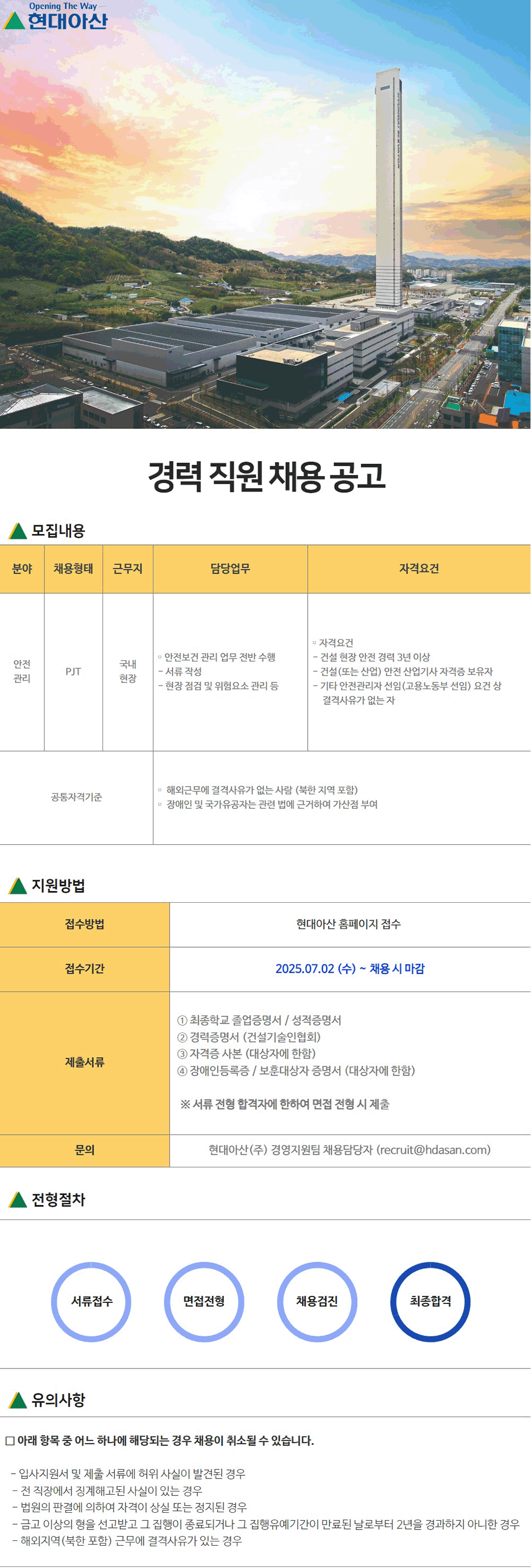 현대아산, 건설안전관리 경력직 모집 (PJT 현장)