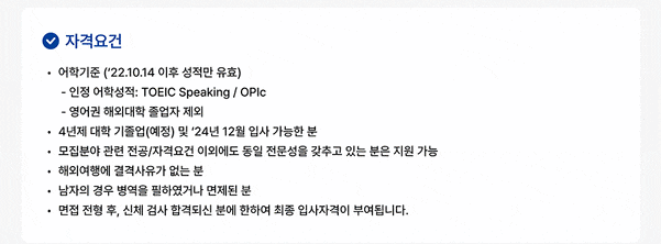 - 전공, 병역, 해외여행 결격 여부 등만 확인합니다.