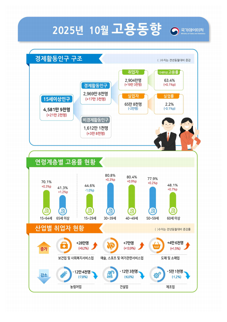 보건업 및 사회복지서비스업에서 28만명 늘며 고용 증가를 주도했다. 예술·스포츠 및 여가 관련 서비스업(7만명), 도매·소매업(4만6000명)에서도 증가세가 이어졌다.