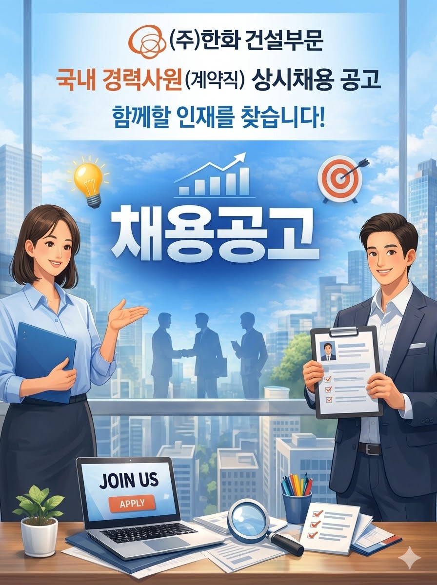 한화 건설부문이 국내 건설현장 인력 확보를 위해 경력사원 상시 채용을 진행한다. 토목, 건축, 안전관리, 품질, 현장관리, 경영지원 등 다양한 직무에서 인력을 모집하며 채용은 계약직 형태로 진행된다.