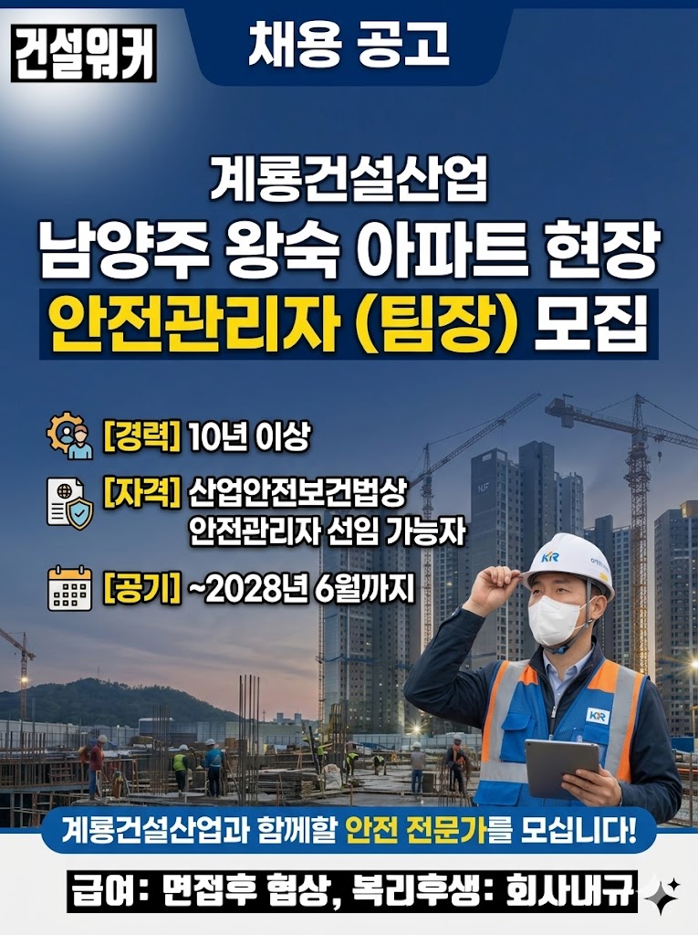 계룡건설산업이 경기도 남양주 왕숙 아파트 건설현장에서 근무할 안전관리자(팀장)를 모집합니다.