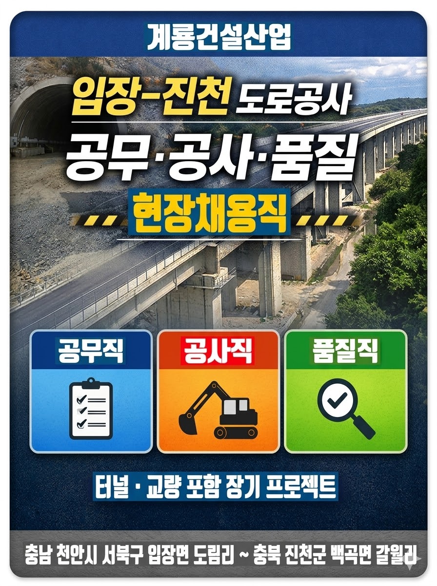 [계룡건설산업(주)] 계룡건설산업 입장~진천 도로건설공사 공무,품질 모집 (마감일 : 04/02) - 건설취업 건설워커