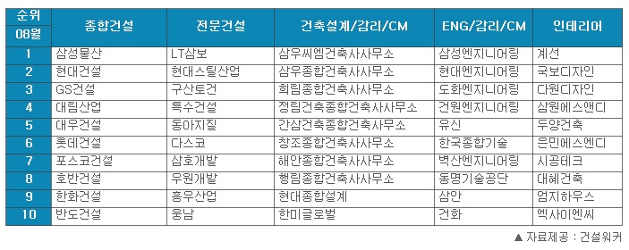 8월 건설사 취업인기순위 부문별 톱10(wr1908.jpg) / 자료=건설워커