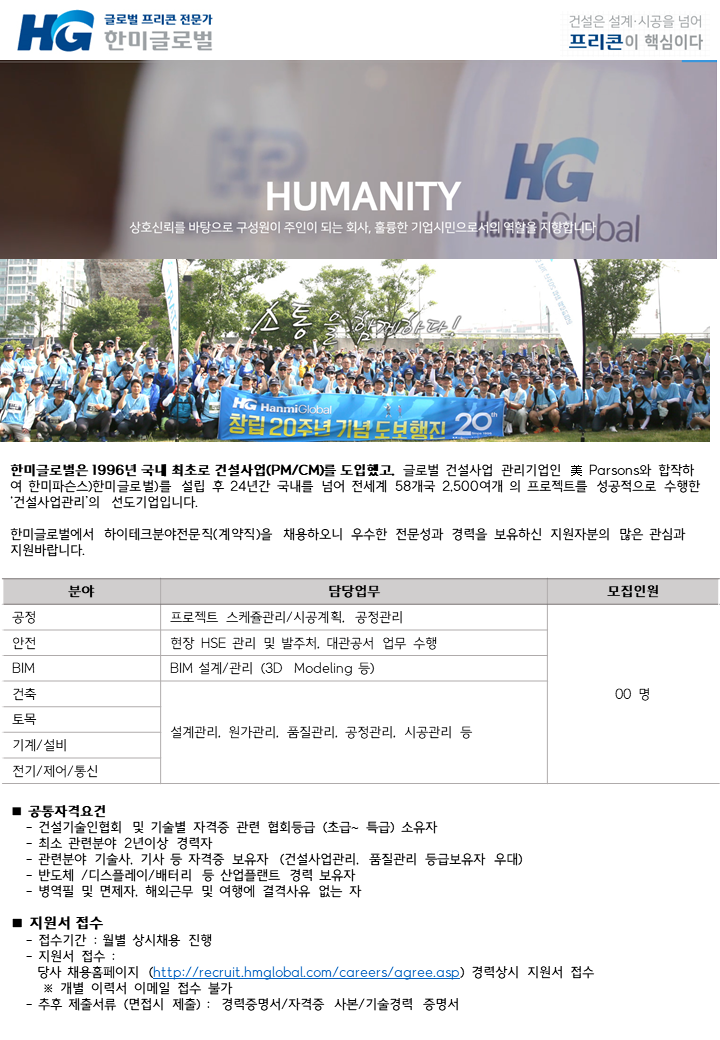 글로벌 프리콘 전문가 한미글로벌이 하이테크 분야 전문직 채용을 진행한다.