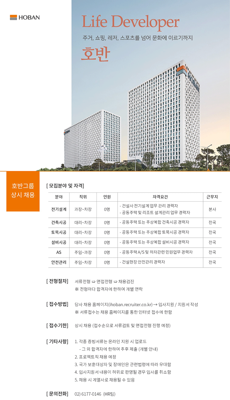 호반그룹 호반건설이 상시채용을 진행한다. 모집분야는 전기설계, 건축시공, 토목시공, 설비시공, AS, 안전관리 등이며 회사 채용 홈페이지에서 입사지원하면 된다. 접수순으로 서류검토 및 면접을 진행하며, 자격요건은 분야별 경력 충족자다.
