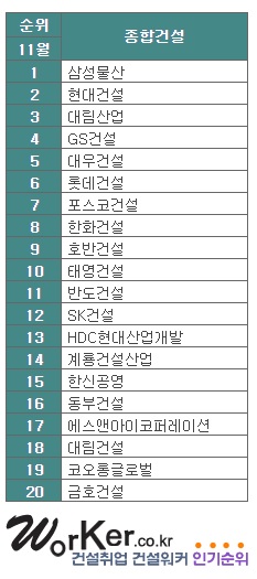 건설워커가 11월 건설사 취업인기순위를 공개했다.