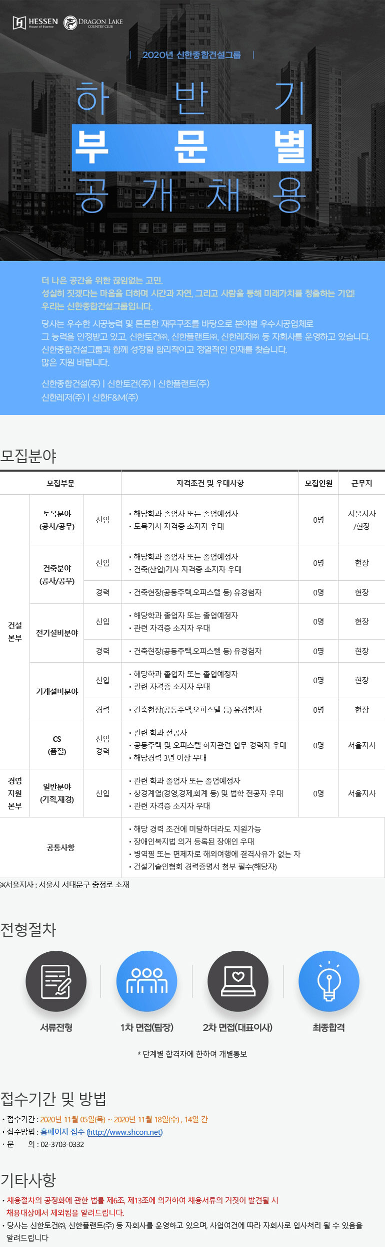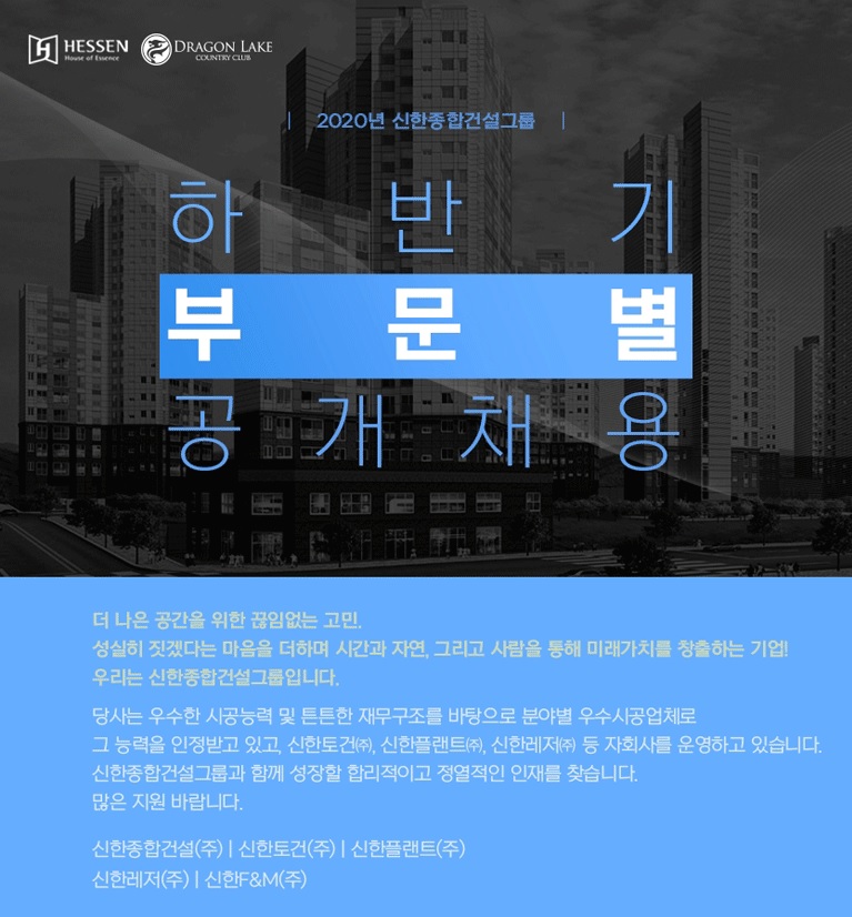 신한종합건설그룹 2020년 하반기 부문별 공개채용…서류접수 18일까지