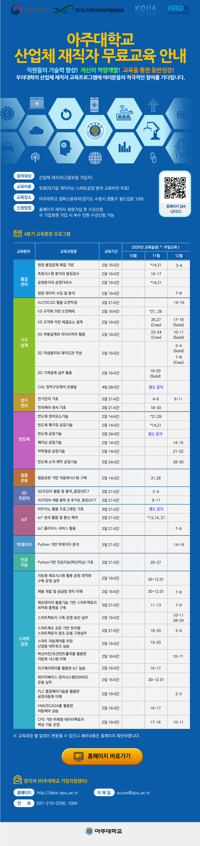 아주대학교 기업지원센터가 산업체 재직자 4분기(11월~12월) 교육훈련 프로그램의 교육생을 모집한다.