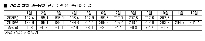 10월 취업자 수 2천708만8천명, 전년비 42만1천명↓… "코로나19 장기화에 바닥 안 보여" 건설업은?