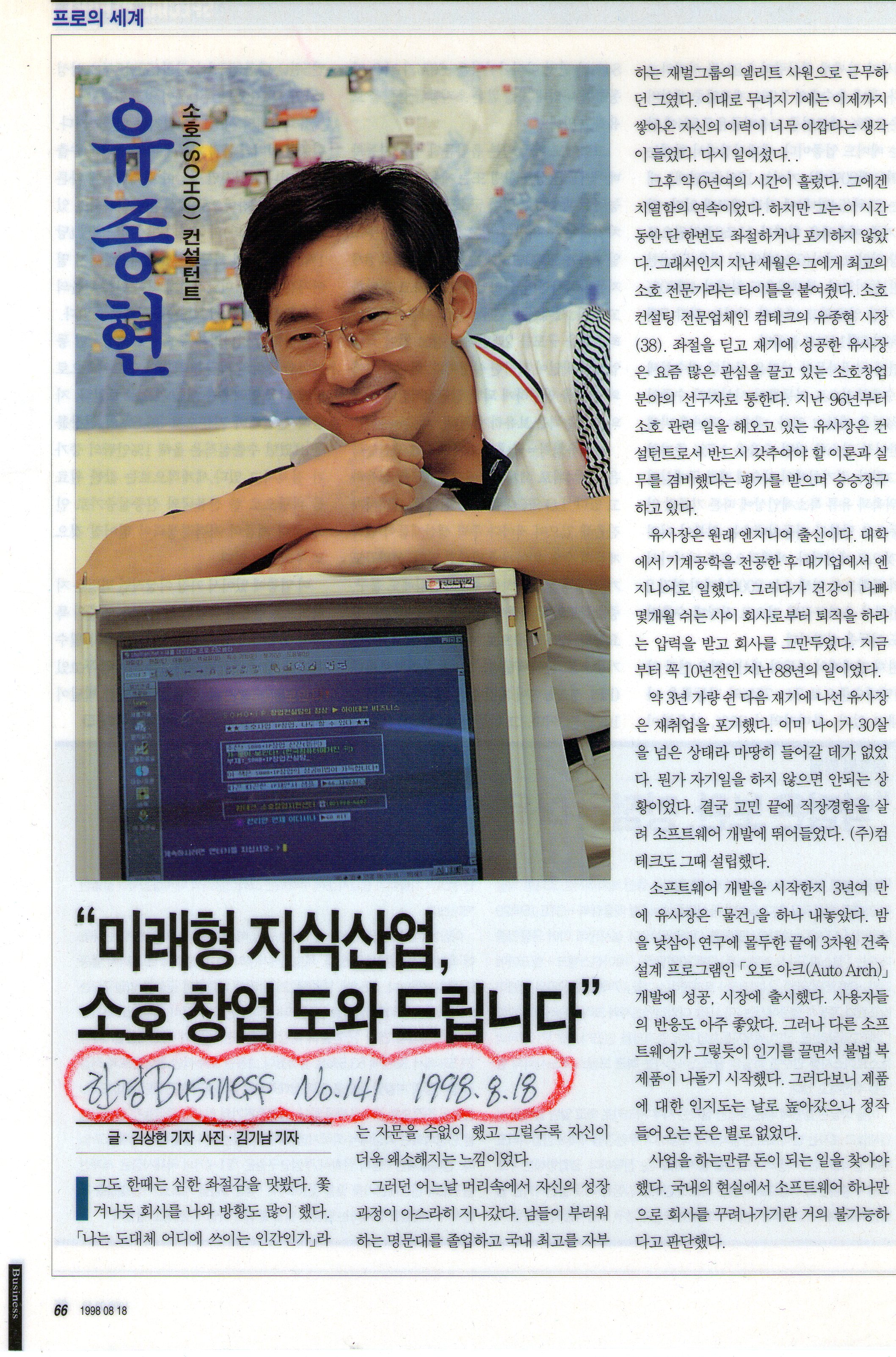 그후 약 6년여의 시간이 흘렀다. 그에겐 치열함의 연속이었다. 하지만 그는 이 시간동안 단 한번도 좌절하거나포기하지 않았다. 그래서인지지난 세월은 그에게 최고의소호 전문가라는 타이틀을 붙여줬다. 소호컨설팅 전문업체인 컴테크의 유종현 사장(38).