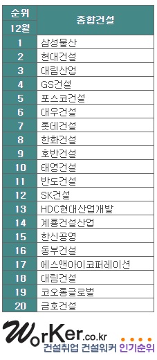 - 12월 종합건설 부문 취업인기순위 톱20(wr2012_20.jpg) / 자료=건설워커