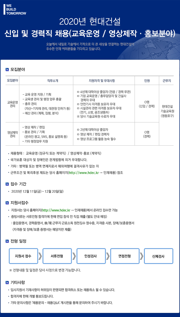 #건설워커 #단독채용속보 #현대자동차그룹 #현대건설 #신입사원채용 #경력사원채용 #현대건설기술교육원 #교육운영 #영상제작 #홍보분야