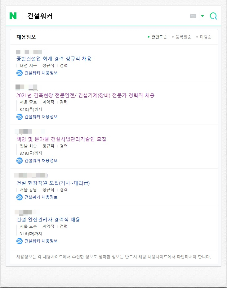건설취업플랫폼 건설워커(대표 유종현)는 자사가 보유한 채용공고 DB를 네이버 PC버전 통합검색 내 채용정보 컬렉션을 통해 제공한다고 15일 밝혔다. 지난해 12월 모바일 버전 출시 후 3개월 만이다.