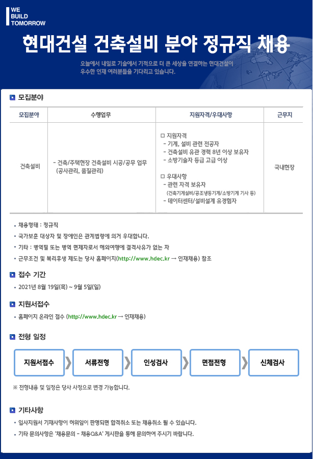 입사희망자는 다음달 5일까지 현대건설 홈페이지 인재채용에서 입사지원하시면 됩니다.