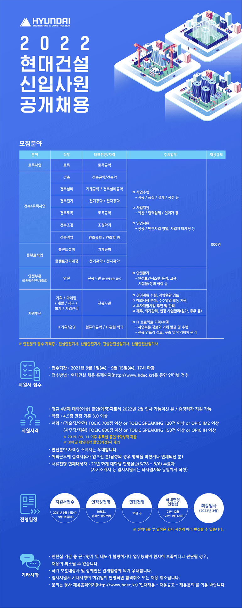 국내 건설업계의 ‘맏형’으로 불리는 현대건설이 2022년 신입사원 공개채용을 진행한다.