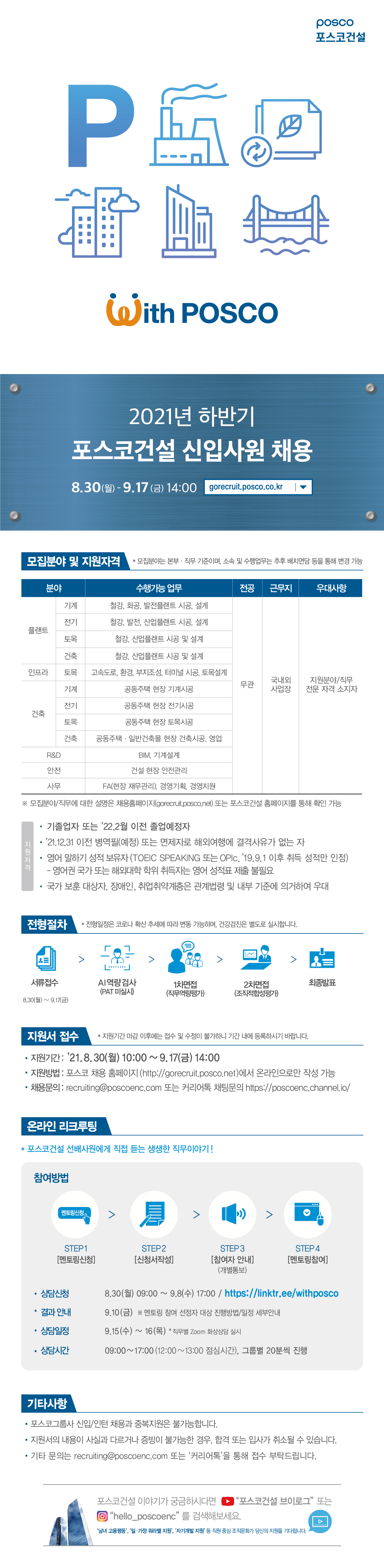 포스코건설이 하반기 신입사원을 모집한다. 모집분야는 △플랜트(기계, 전기, 토목, 건축) △인프라(토목) △건축(기계, 전기, 토목, 건축) △R&D △안전 △사무이며 17일까지 포스코 채용 홈페이지에서 입사지원하면 된다. 지원자격은 △기졸업자 또는 22년 2월 이전 졸업예정자 △TOEIC SPEAKING, OPIC 등 영어 말하기 성적 보유자(2019년 9월 1일 이후 취득 성적) 등이다. 단 영어권 국가 또는 해외대학 학위 취득자는 영어 성적표 제출하지 않아도 된다.