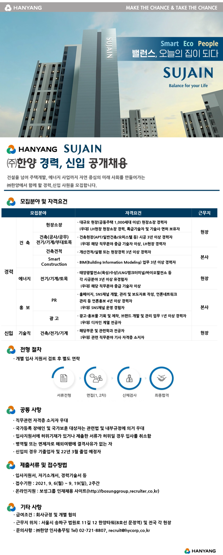 한양이 경력 및 신입사원 채용을 진행한다. 모집부문은 △건축 △전기 △기계 △토목 △건축견적 △Smart Construction △홍보(PR, 광고) 등며 19일까지 보성그룹 인재채용 사이트에서 입사지원하면 된다. 지원자격은 △해당 부문 및 관련학과 전공자 △신입의 경우 기졸업자 및 22년 2월 졸업예정자 △경력직은 직무별 경력 충족자 등이다. 직무 관련 자격증 소지자는 우대한다.