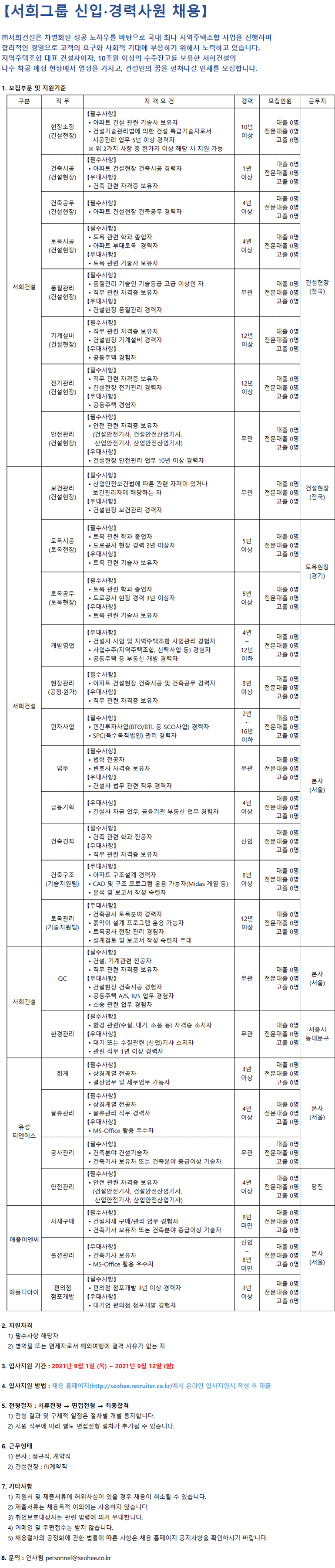 서희건설이 신입 및 경력사원을 모집한다. 모집부문은 △건축 △토목 △품질관리 △기계설비 △전기관리 △안전관리 △보건관리 △개발영업 △현장관리 △민자사업 △법무 △금융기획 △QC △환경관리 등이며 12일까지 회사 채용홈페이지에서 입사지원하면 된다. 자격요건은 △관련 학과 졸업자 △직무 관련 자격증 소지자 등이며, 경력직은 직무별 경력 충족자이어야 한다.