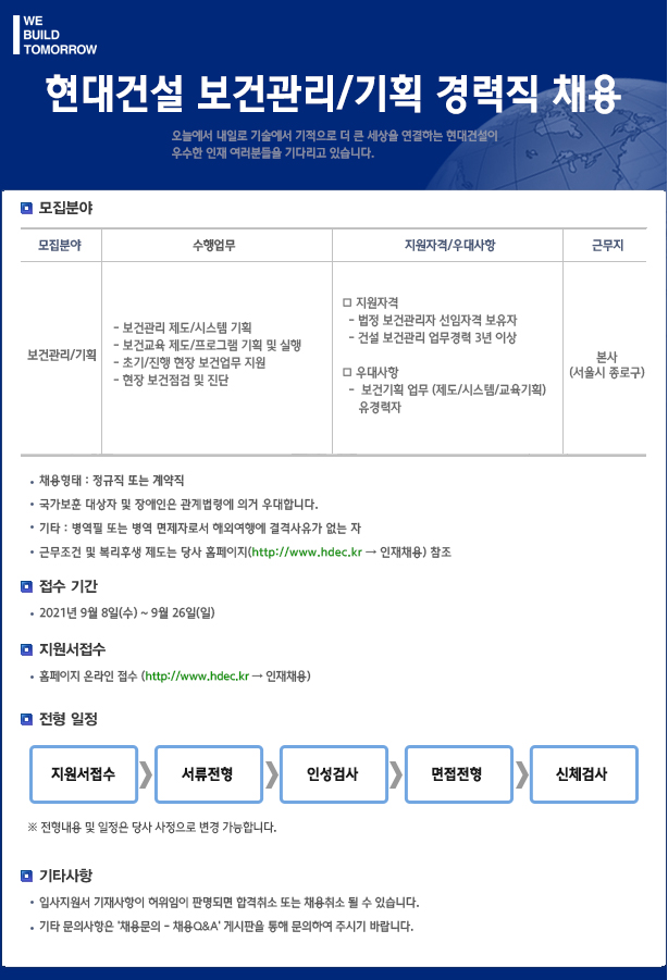 ■ 현대건설 경력사원 모집… 서류접수 마감일 26일