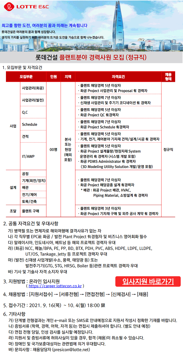 ■ 롯데건설 플랜트분야 정규직 경력사원 모집