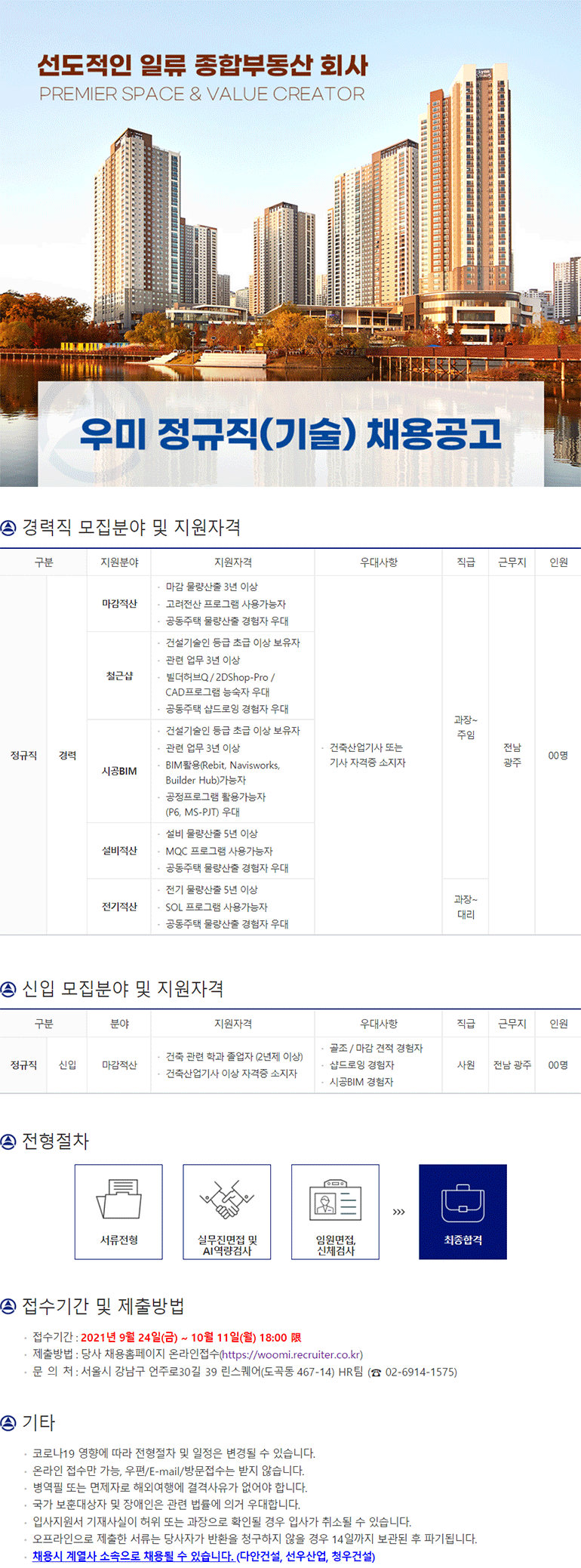 입사희망자는 10월 6일까지 회사 채용홈페이지에서 입사지원하면 된다. 자격요건은 △학사 이상 △직무 경력 충족자이며 관련 전공 및 자격 보유자와 해외현장 및 동종사 유경험자는 채용시 우대한다.