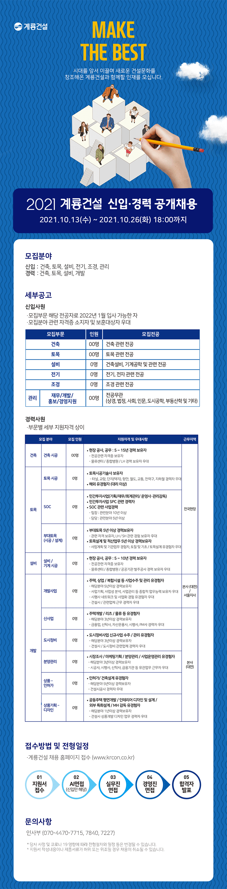 입사희망자는 오는 26일(화)까지 계룡건설 채용 홈페이지에서 온라인 입사지원서하면 된다.