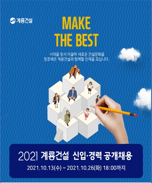 입사희망자는 오는 26일(화)까지 계룡건설 채용 홈페이지에서 온라인 입사지원서하면 된다.