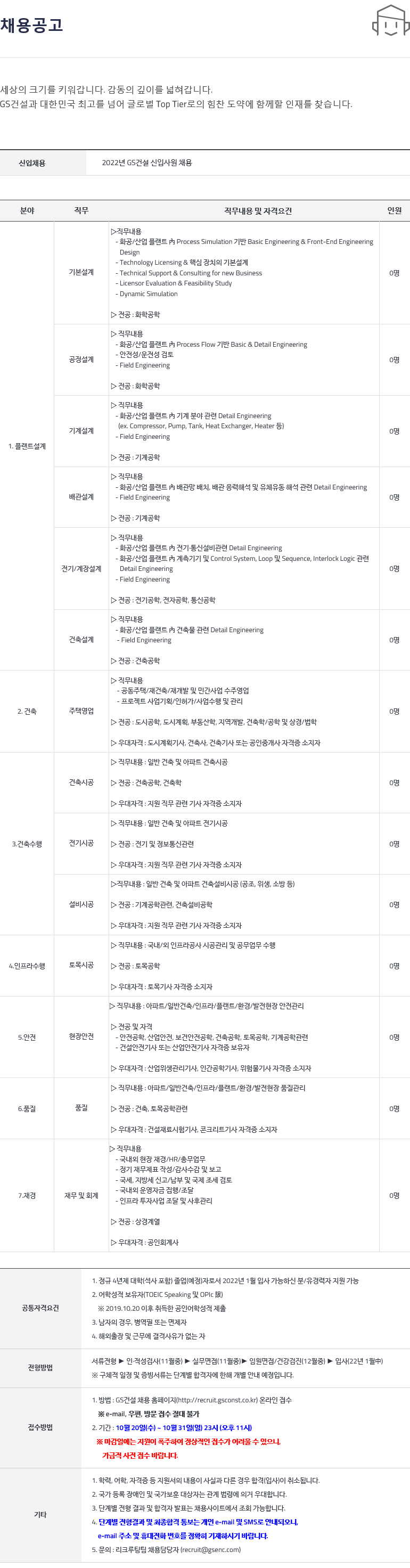 GS건설, 2022년 신입사원 채용… 플랜트설계,건축,토목,안전,품질,재경 등 모집