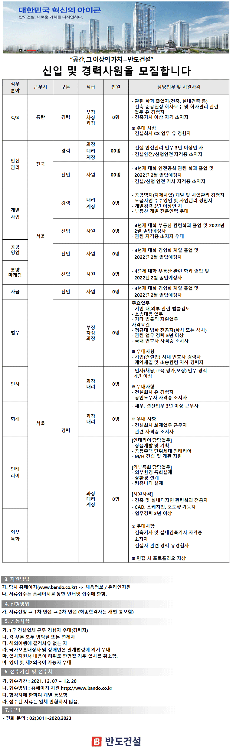 중견건설사 반도건설이 2021년 하반기 신입 및 경력사원 공개 채용을 진행한다.