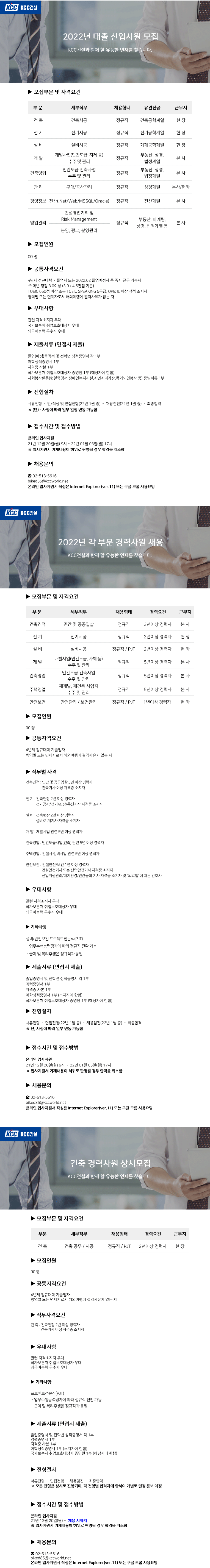 KCC건설이 대졸 신입 및 경력사원을 모집한다. 모집부문은 건축, 전기, 설비, 개발, 건축영업, 주택영업, 안전보건, 관리, 경영정보, 영업관리 등이며 내년 1월 3일까지 회사 홈페이지에서 입사지원하면 된다. 신입사원 자격요건은 △4년제 정규대학 기졸업자 또는 2022년 2월 졸업예정자 중 즉시 근무 가능자 △전학년 평점 3.0 이상(4.5만점 기준) △토익점수 650점 이상 또는 토익스피킹 5등급, OPIc IL 이상 성적 소지자 등이다. 관련 자격증 소지자와 외국어 능력 우수자는 우대한다.