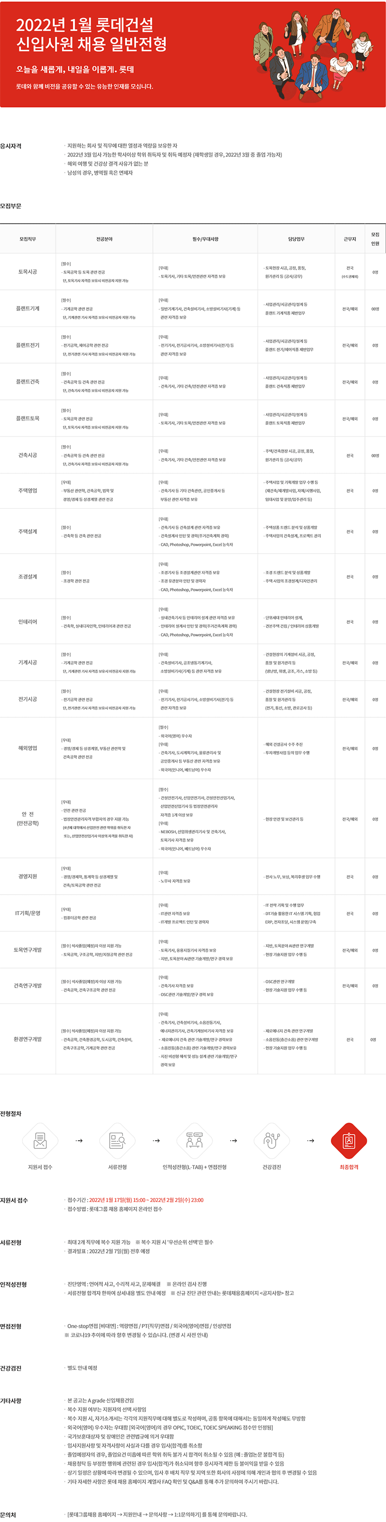 롯데건설이 2월 2일까지 2022년 1월 신입사원 채용을 진행한다. 모집직무는 △토목시공 △플랜트기계 △플랜트전기 △플랜트건축 △플랜트토목 △건축시공 △주택영업 △주택설계 △조경설계 △인테리어 △기계시공 △전기시공 △해외영업 △안전(안전공학) △경영지원 △IT기획·운영 △토목연구개발 △건축연구개발 △환경연구개발 등이다.