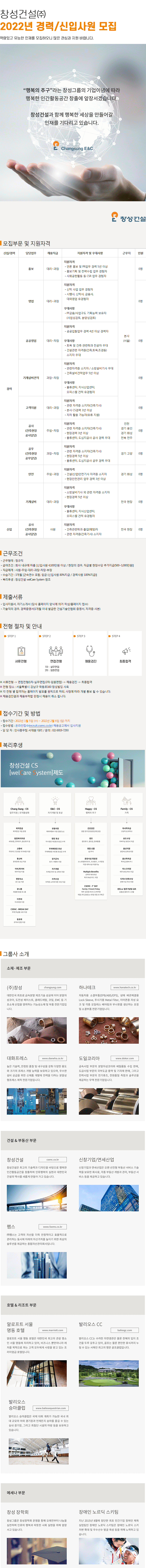 창성건설이 2월 6일까지 2022년 경력 및 신입사원을 모집한다. 모집부문은 △홍보 △영업 △공공영업 △기계설비견적 △고객지원 △공사 △공무 △안전 △기계설비 등이며 지원자격은 △(신입) 건축관련학과 졸업(예정)자 △(경력직) 직무별 경력 충족자 △(기술직) 관련 자격증 소지자 등이다.