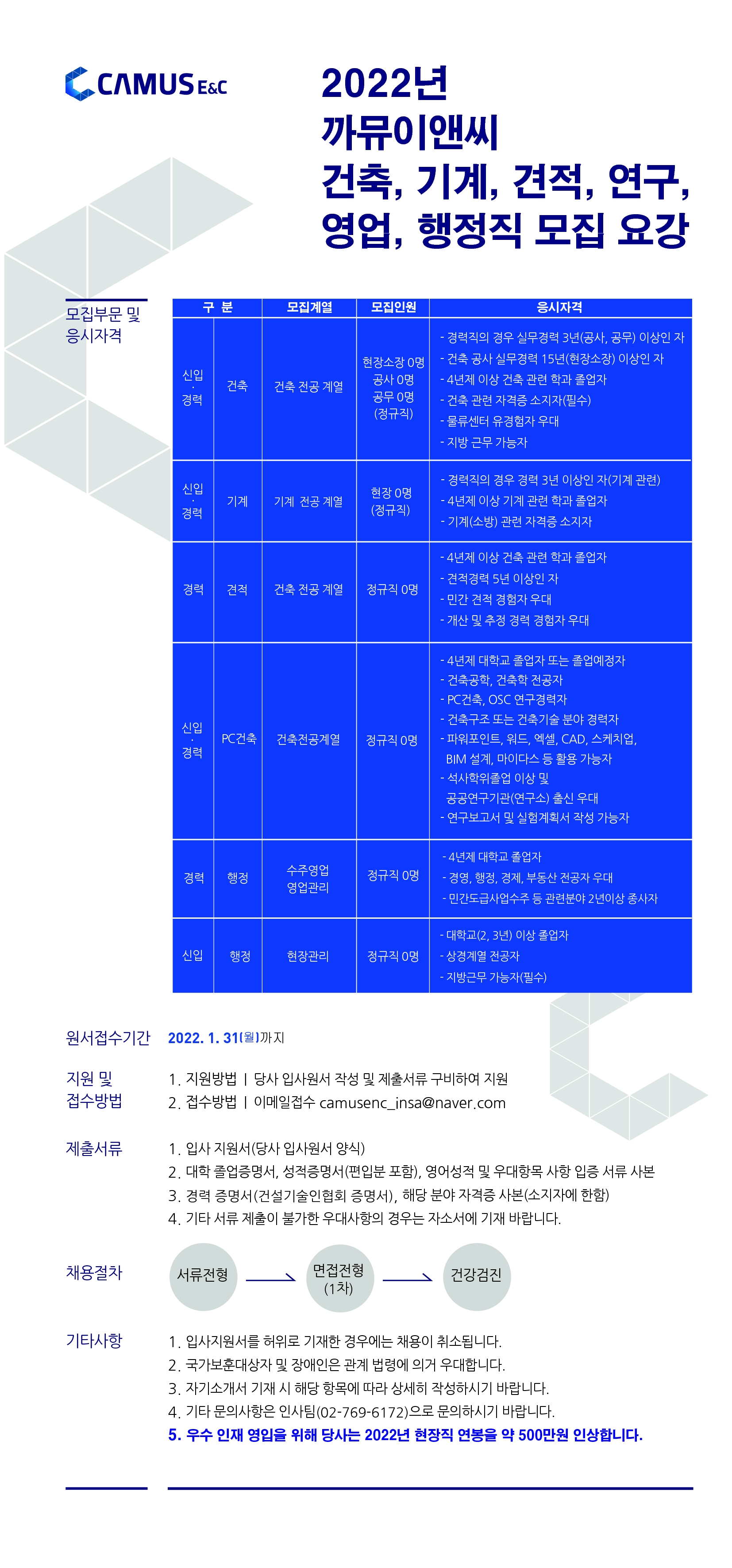 까뮤이앤씨가 오는 31일까지 신입 및 경력사원을 모집한다. 모집부문은 △건축(공사, 공무) △기계 △견적 △연구 △영업 △행정(현장관리) 등이며 응시자격은 △(기술직) 4년제 대학교 관련학과 졸업자 또는 졸업예정자 △(신입 행정직) 대학교(2,3년제) 이상 졸업자, 상경계열 전공자, 지방근무 가능자 △(기술직) 관련 자격증 소지자 △(경력직) 직무별 경력 충족자 등이다.