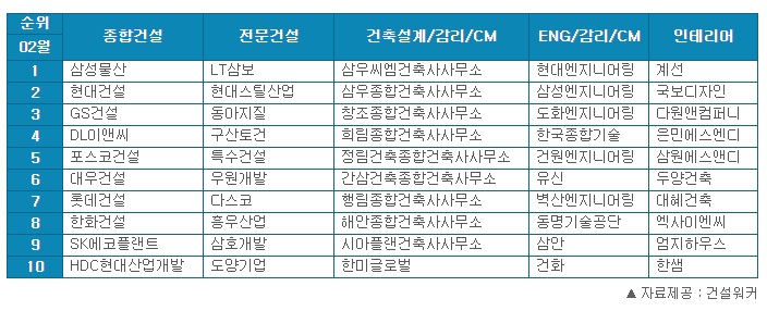 건설워커 랭킹은 2002년 시작된 월간 건설사 취업인기순위차트다. 건설워커는 △구인정보 조회수 △키워드 검색량 △기업DB 조회수 △회원투표결과 등 자체 빅데이터 분석을 통해 구직자들의 취업선호도와 관심도를 파악하고, 이를 기준으로 매월 건설사 순위를 발표하고 있다.
