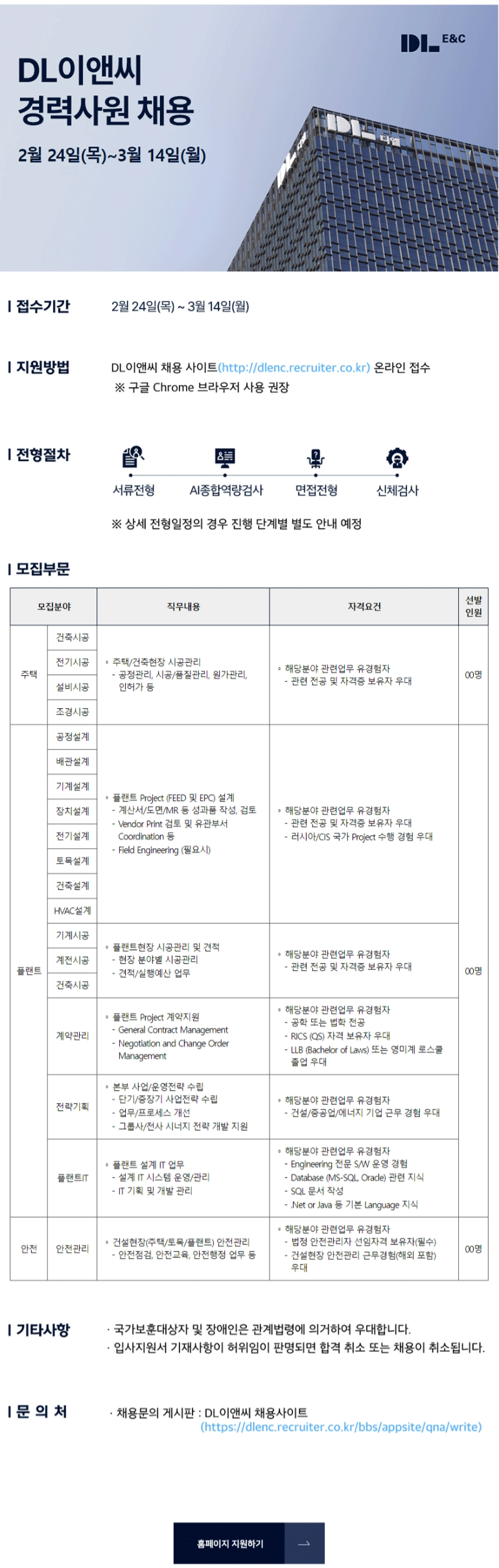 모집분야는 주택(건축시공, 전기시공, 설비시공, 조경시공), 플랜트(공정설계, 배관설계, 기계설계, 장치설계, 전기설계, 토목설계, 건축설계, HVAC설계, 기계시공, 계전시공, 건축시공, 계약관리, 전략기획, 플랜트IT), 안전관리 등이며 14일까지 DL이앤씨 채용사이트에서 입사지원하면 된다. 자격요건은 △해당 분야 관련 업무 유경험자 △관련 전공 및 자격증 보유자 우대 등이다.
