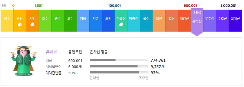 은하신은 지식인 등급 중 상위 4번째 '신의 경지'에 이른 전문가를 말한다. 지식iN 내공 60만점(초과), 채택 답변수 6,000개 이상이어야 한다.