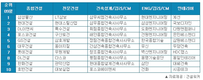 건설워커(대표 유종현)가 '9월 건설워커 랭킹'을 공개했습니다.