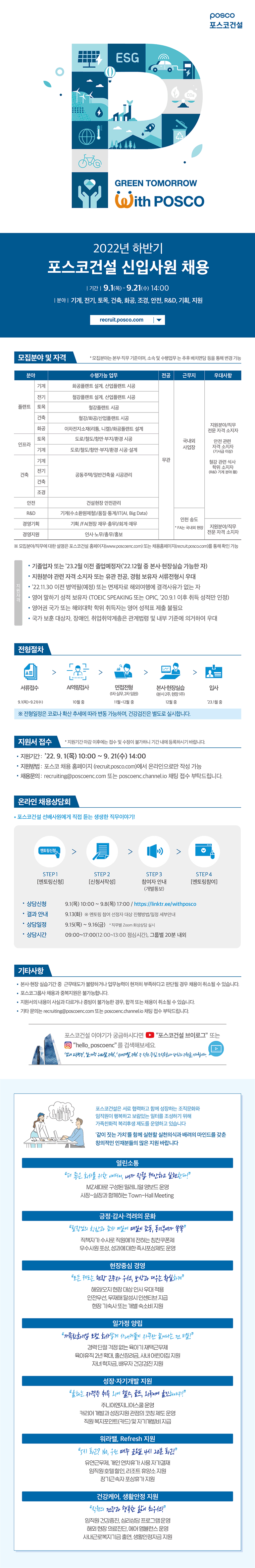 포스코건설이 2022년 하반기 신입사원 채용에 나선다.