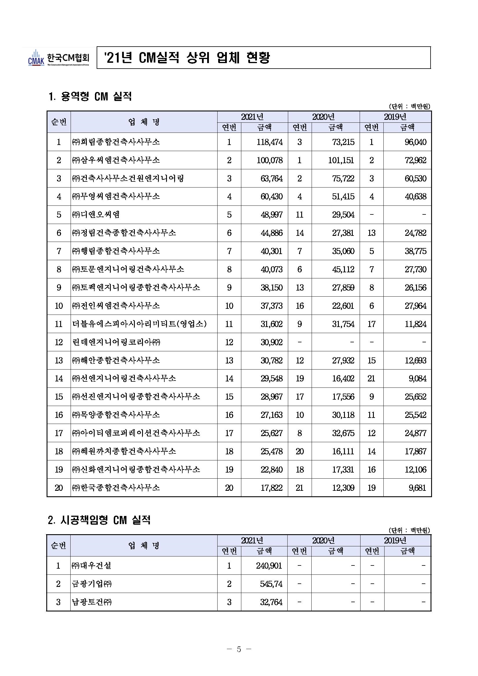2022년도 건설사업관리(CM) 능력평가 상위업체 톱20 (희림건축, 삼우씨엠, 건원엔지니어링 순)