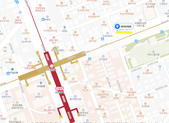 위치: 9호선 신논현역 3번출구에서 도보 2분 (80미터)