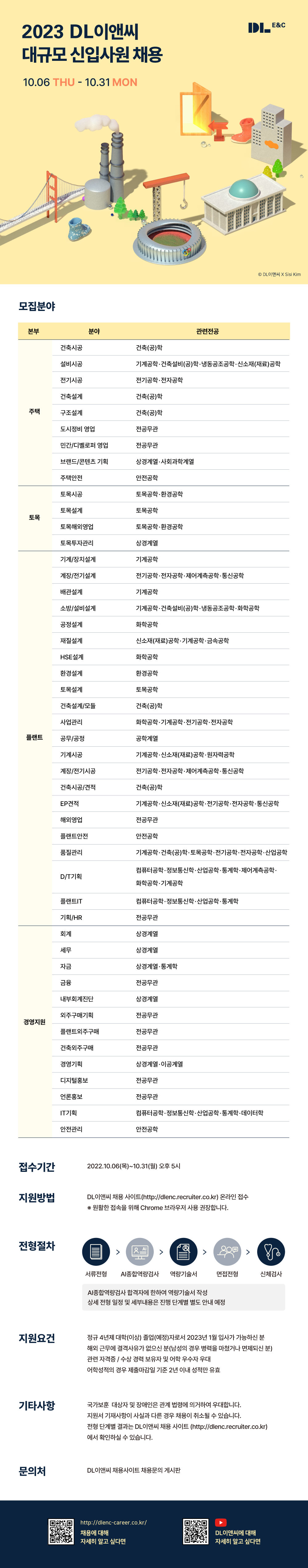 자세한 내용은 건설워커 홈페이지에서 DL이앤씨 2023년 대규모 신입사원 채용공고를 참고하면 된다.