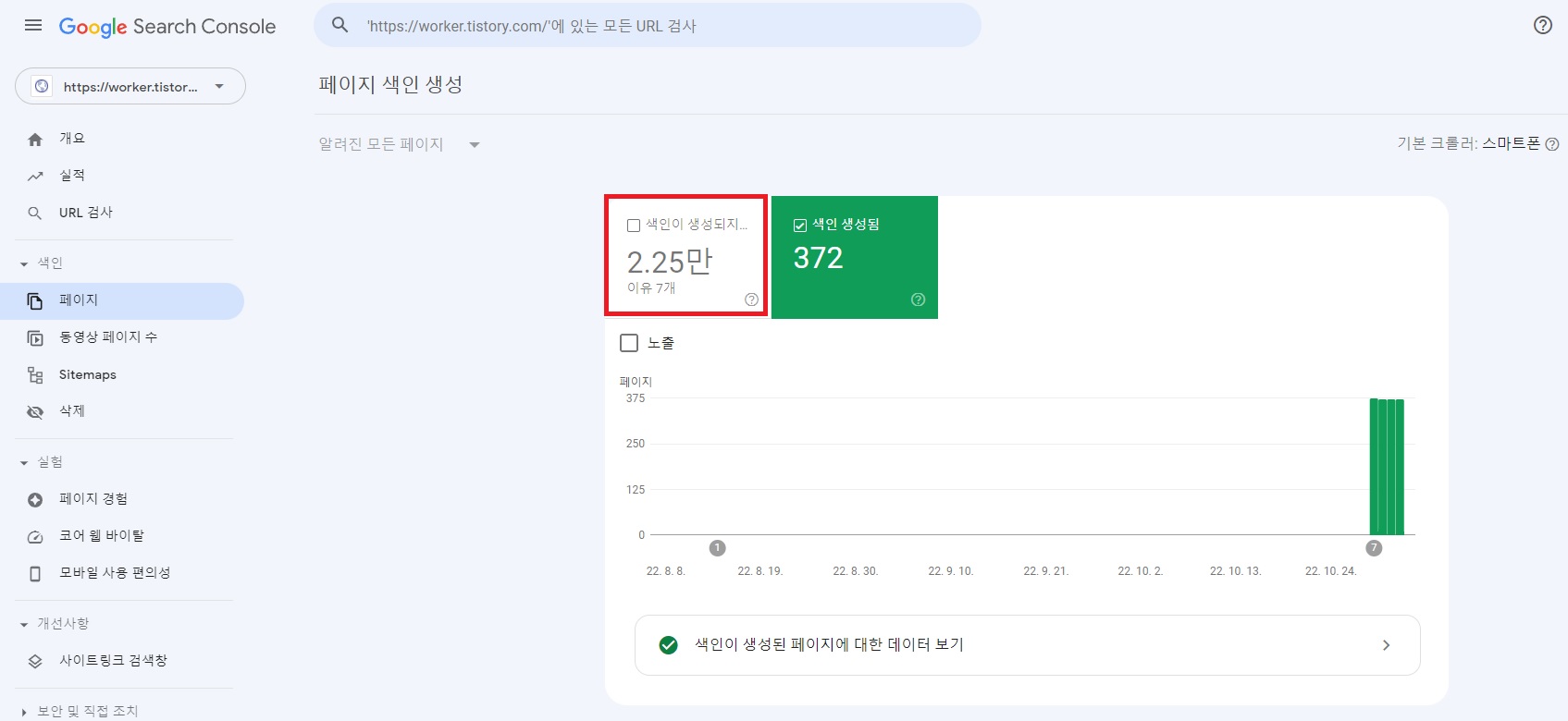 구글 서치 콘솔에서 내 티스토리 블로그의 색인 페이지를 확인해보니 색인이 생성되지 않은 페이지가 2.25만개다. (아래 화면)